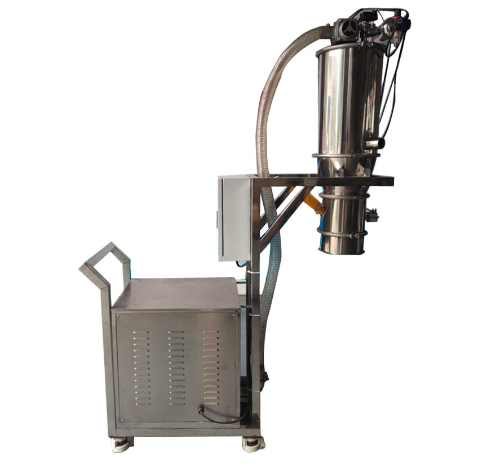 真空上料機(jī)是用真空泵抽氣,使吸料嘴進(jìn)口處及整個(gè)系統(tǒng)處于一定的真空狀態(tài),粉粒料隨同外界空氣被吸入料嘴,形成料氣流,經(jīng)過(guò)吸料管到達(dá)料斗,在料斗中進(jìn)行氣、料分離。分離后的物料進(jìn)入受料設(shè)備。輸送、放料是通過(guò)氣動(dòng)三通閥不斷地開(kāi)、閉來(lái)完成的,而氣動(dòng)三通閥的開(kāi)閉是由控制中心來(lái)控制的。 ZKS 真空上料機(jī)中裝有壓縮空氣反吹裝置,每次放料時(shí),壓縮空氣脈沖反吹過(guò)濾器,把吸附于過(guò)濾器表面的粉末打落下來(lái),使吸料能正常運(yùn)行。